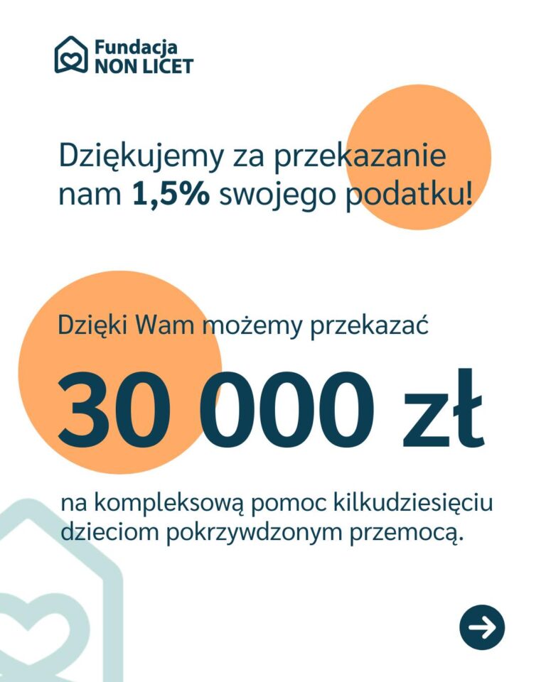 Dziękujemy za przekazanie nam 1,5% swojego podatku! Dzięki Wam możemy przekazać 30 000 zł