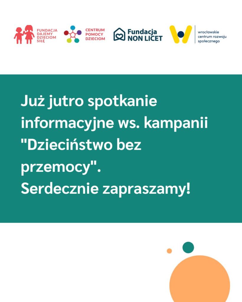 Zapraszamy na spotkanie informacyjnie związane z organizacją kampanii “Dzieciństwo bez przemocy 2025” we Wrocławiu. Spotkanie odbędzie się jutro – 30 lipca, godz. 14.00 w Przejściu Dialogu (ul. Świdnicka 19). Bardzo dziękujemy za gościnę Wrocławskie Centrum Rozwoju Społecznego Kampania jest coroczną inicjatywą koordynowaną centralnie przez Fundacja Dajemy Dzieciom Siłę mobilizującą całe społeczeństwo do zapobiegania krzywdzeniu […]